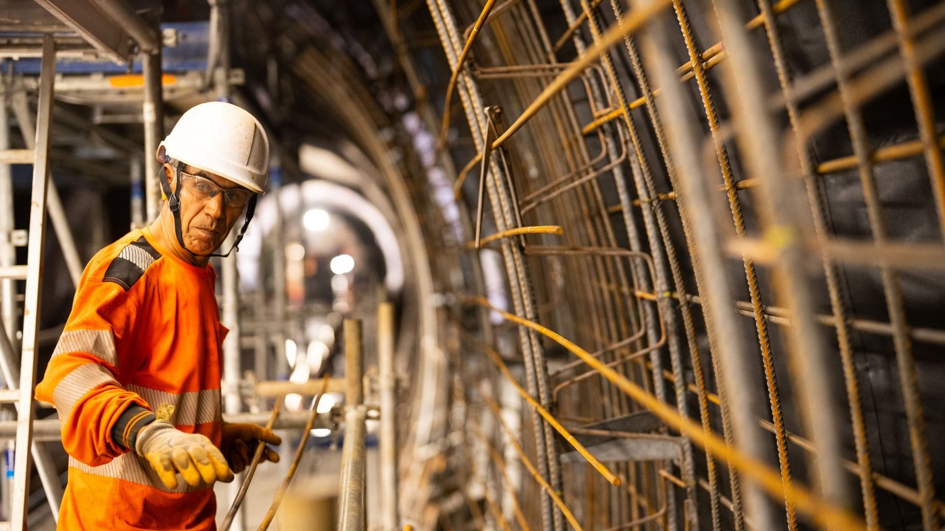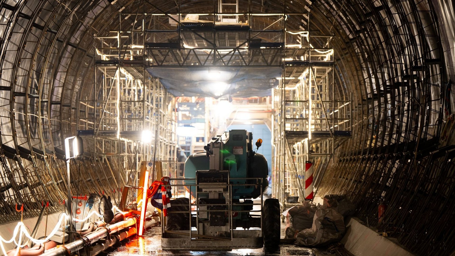 Mithilfe des Bewehrungsportals bringen unsere Mitarbeitenden etwa 10 Tonnen Stahlbewehrung an, wodurch der Tunnel um 10 Laufmeter armiert werden kann. Dieser anspruchsvolle Vorgang erfordert sorgfältige Arbeit: Die Stahlbewehrung wird vollständig von Hand positioniert und gebunden.