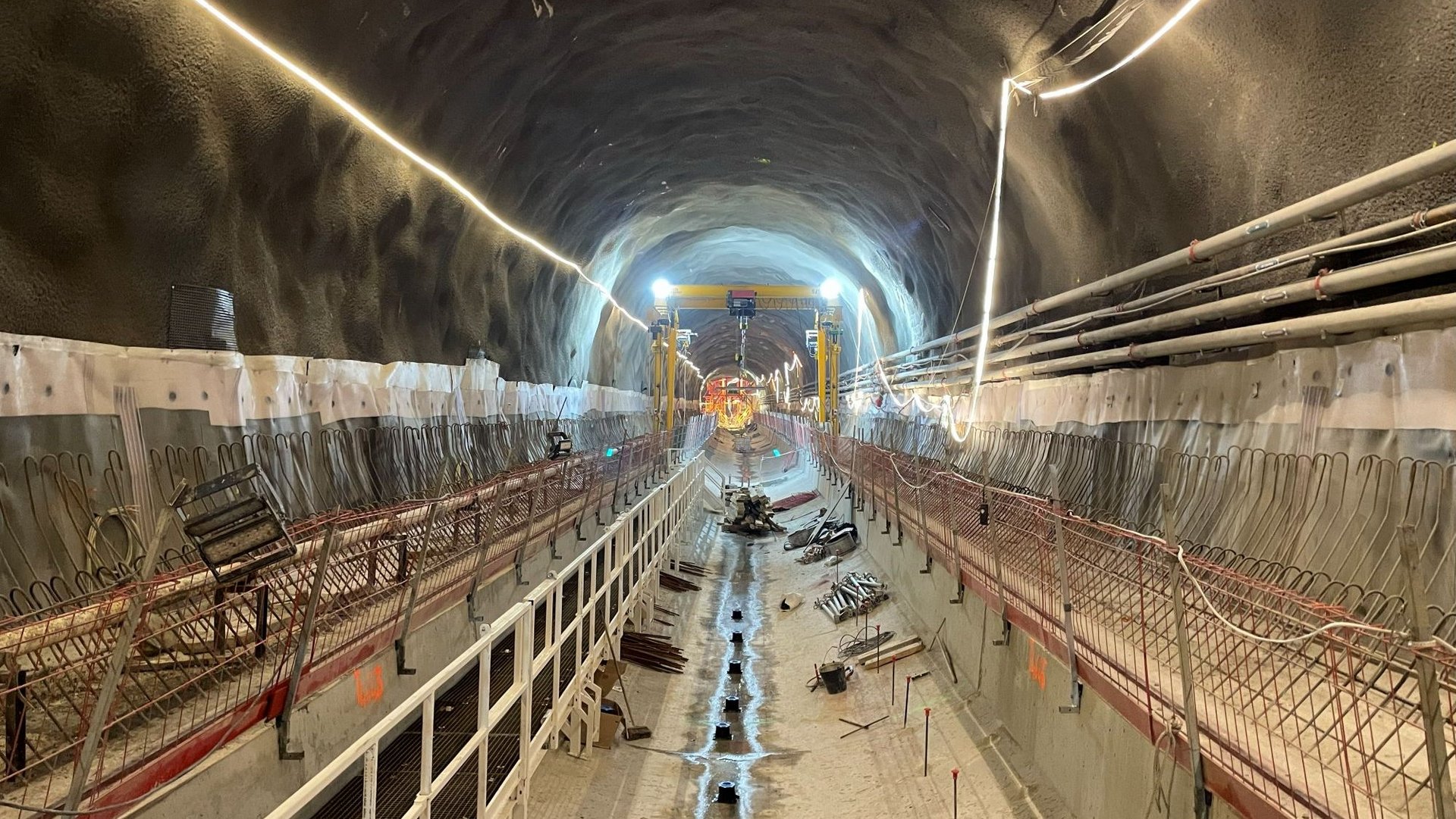 Die Arbeiten werden derzeit auf dem Gleis Süd (rechte Tunnelröhre) ausgeführt, während das Gleis Nord (linke Tunnelröhre) weiterhin für die Logistik der Tunnelvortriebe genutzt wird, die parallel noch im Gange sind. In einer späteren Phase werden alle Schalungseinrichtungen verdoppelt, um die Auskleidung in beiden Röhren fortzusetzen.