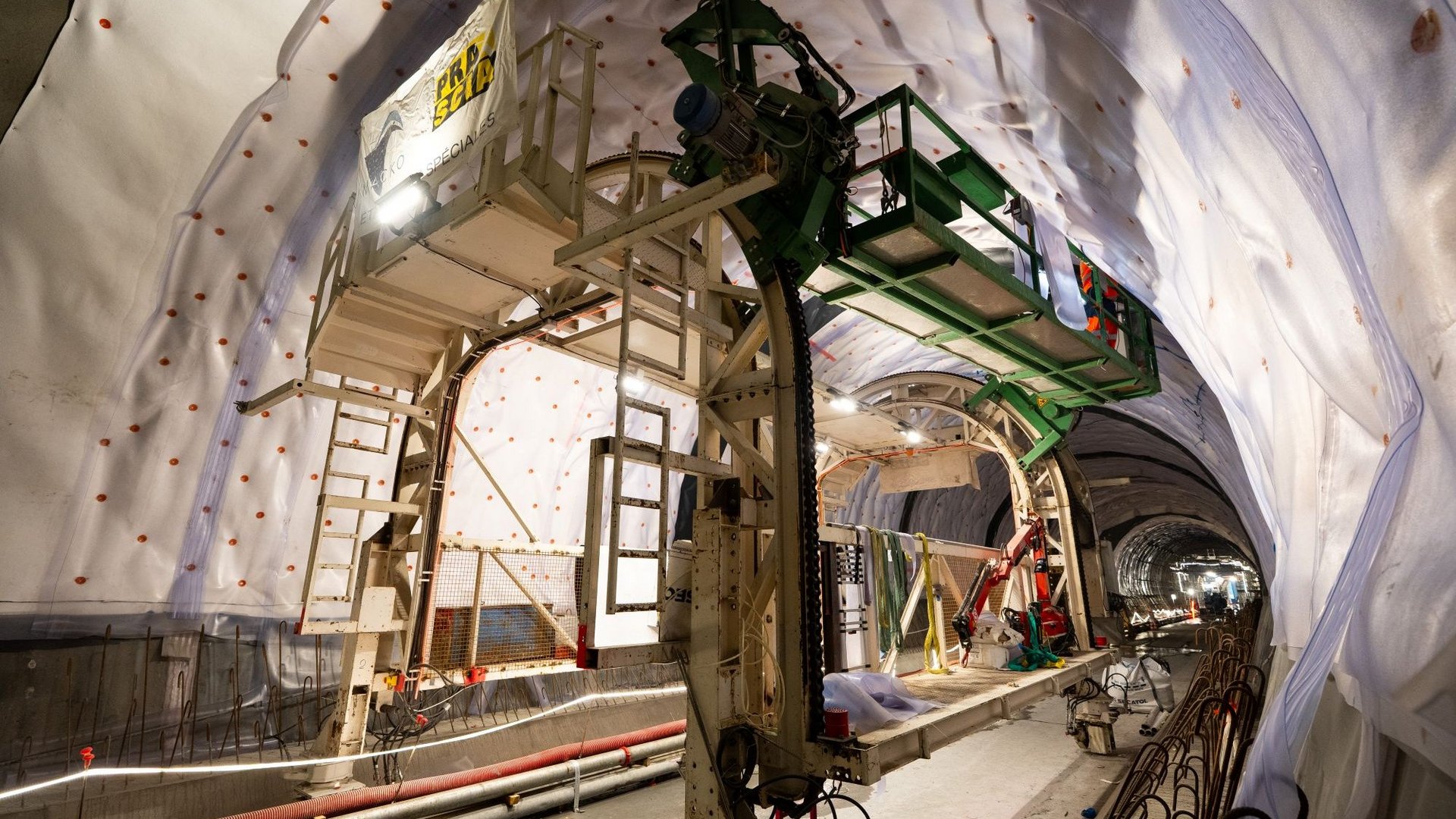 Die Ausführung der Tunnelverkleidung am Eingang des Mont-Cenis-Basistunnels veranschaulicht die Komplexität und Präzision, die für ein Bauwerk dieser Grössenordnung erforderlich sind. In jeder Phase müssen die Teams spezifische Anforderungen berücksichtigen, wie z. B. die vorherige Umlegung von Wasser-, Beleuchtungs-, Kommunikations- und Stromnetzen, die notwendig ist, um die für den Baufortschritt benötigten Bereiche freizugeben. Zudem muss die provisorische Fahrbahn vor dem Einsatz der Sohlschalung ausgehoben, vollständig gereinigt und im unteren Bereich fertiggestellt werden. Die provisorische Spritzbetonauskleidung muss geglättet und etwaige Unebenheiten ausgeglichen werden, um die vom Abdichtungssystem geforderten geometrischen Toleranzen einzuhalten.