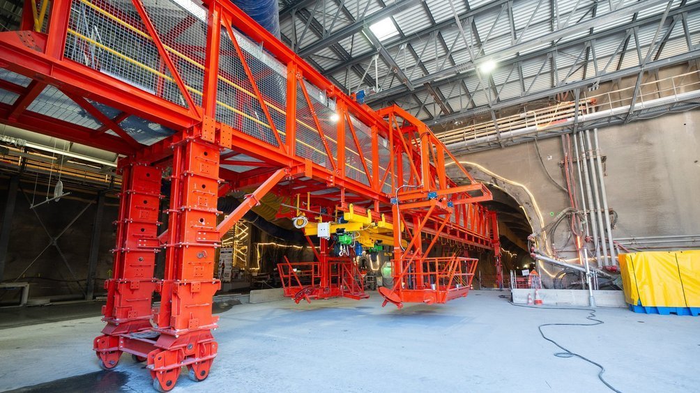 Dieses kurze Video zeigt die Montage aller speziell entwickelten Einrichtungen zur Ausführung der endgültigen Tunnelgewölbe – also des oberen Teils des Bauwerks.