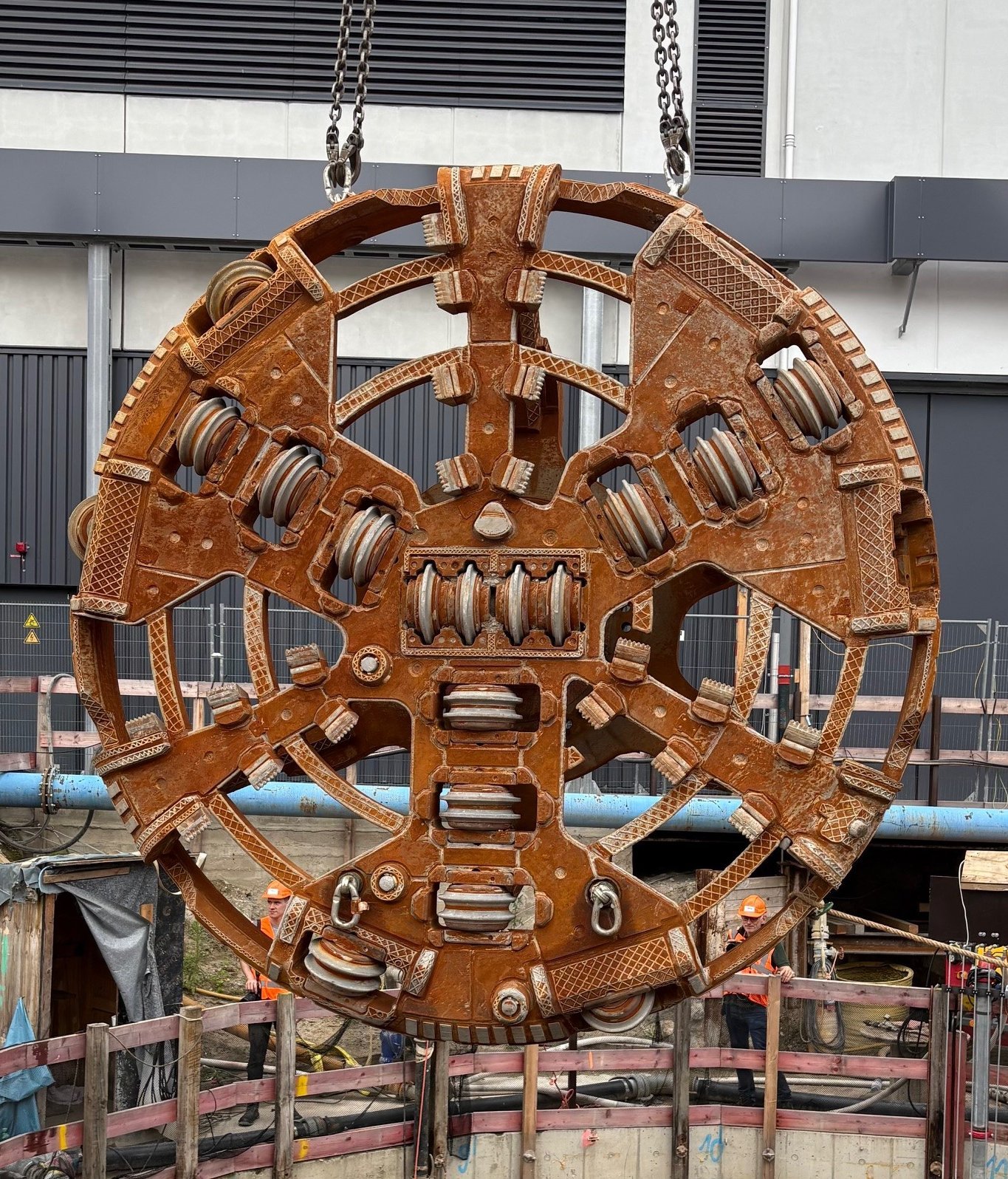 Ein besonderes Highlight: Das rund 20 Tonnen schwere Schneidrad wurde erfolgreich aus dem Zielschacht gehoben – damit wurde der Durchbruch gebührend gefeiert. Hochrangige Gäste wie der Regierende Bürgermeister Kai Wegner und Vertreter von 50Hertz, Elia Group und Implenia würdigten das Projekt als Meilenstein der Energiewende.