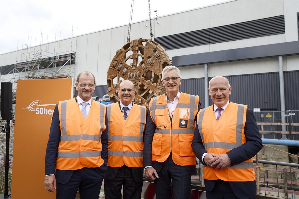 Freuen sich über den Meilenstein: (von links) Stefan Kapferer (CEO 50Hertz), Bernard Gustin (CEO Elia Group), Henning Schrewe (Geschäftsführer Implenia Civil Engineering GmbH), Kai Wegner (Regierender Bürgermeister Berlin)
