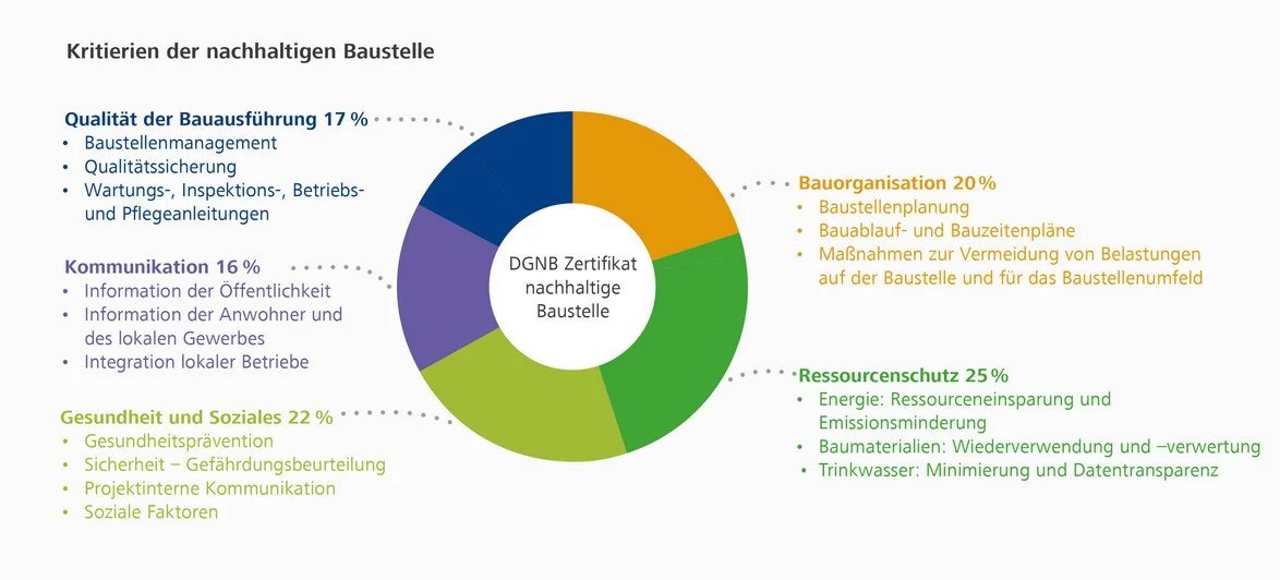 Die Kriterien der DGNB-Zertifizierung «Nachhaltige Baustelle» sind in fünf Hauptbereiche gegliedert, die die fünf Themenfelder Ökologie, Ökonomie, soziokulturelle und funktionale Aspekte, Technik und Prozesse adressieren und so eine ganzheitlich nachhaltige Betrachtung erlauben.