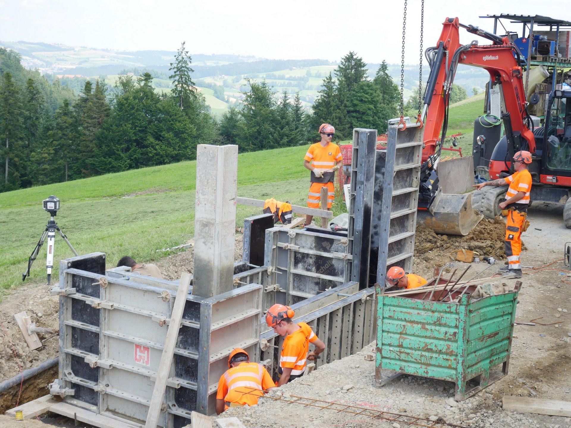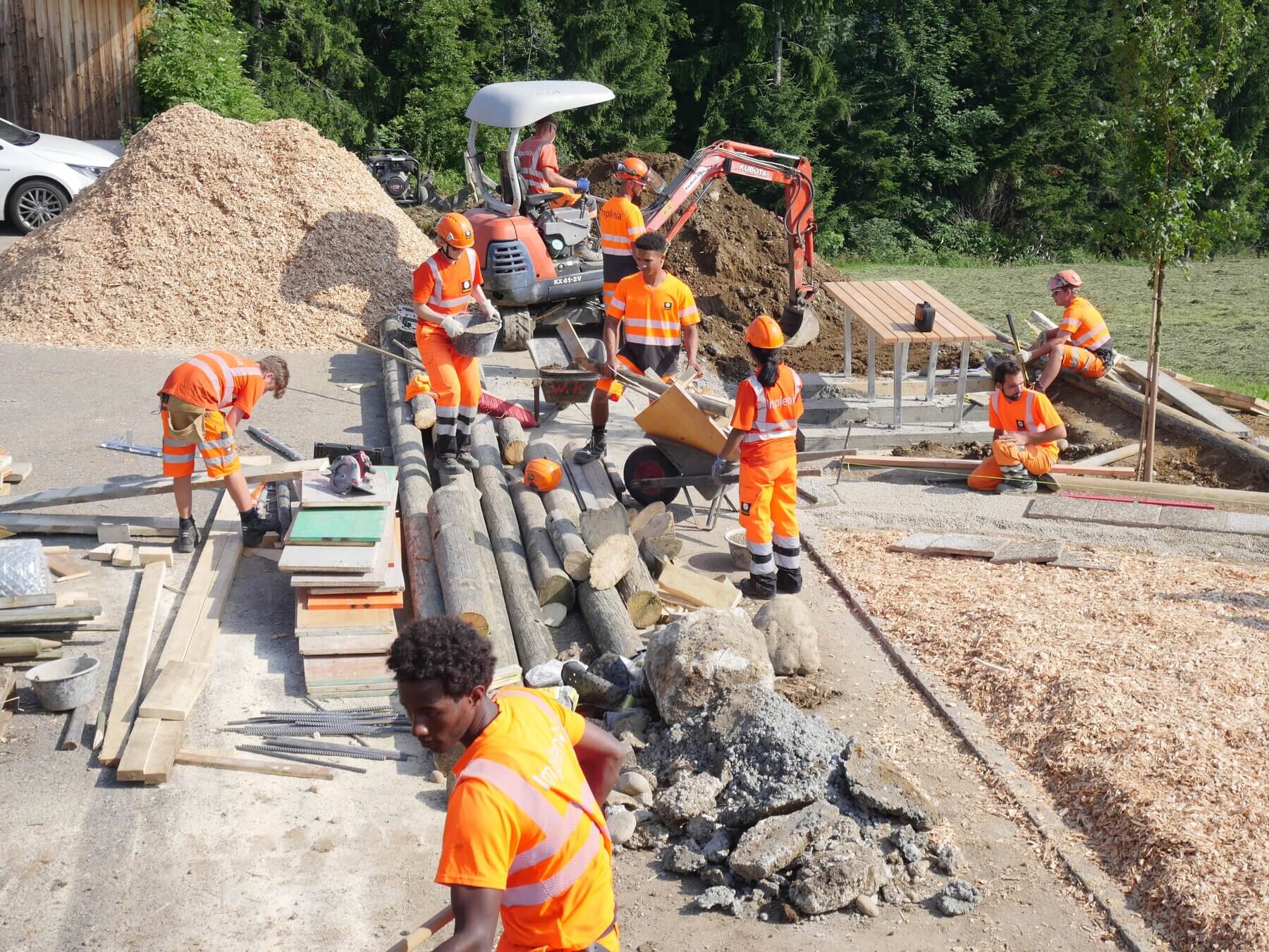 Seit Corona ist die Platzzahl beschränkt: Nur die Besten und Motiviertesten werden eingeladen. 19 von ihnen packten unter der Leitung von drei jungen Vorarbeitern, die vor kurzem selbst die Lehre bei Implenia abgeschlossen haben, Mitte Juli in der ländlichen Region Entlebuch tatkräftig zu und bauten einen neuen Spielplatz, einen Begegnungsplatz im Dorfzentrum von Romoos und einen Maschinenwaschplatz in Steinhuserberg bei Wolhusen. Die Schreiner, Maurer, Baupraktiker, Strassenbauer und Strassenbaupraktiker, Grundbauer und kaufmännische Lernende – die einzigen zwei jungen Frauen in der Gruppe – bewältigten in nur fünf Tagen ein unglaubliches Pensum, von Erdbewegungen mit zwei angemieteten Baggern über Beton- und Schreinerarbeiten bis hin zum Pflanzen von Bäumen und der Ansaat von Magerwiesen.