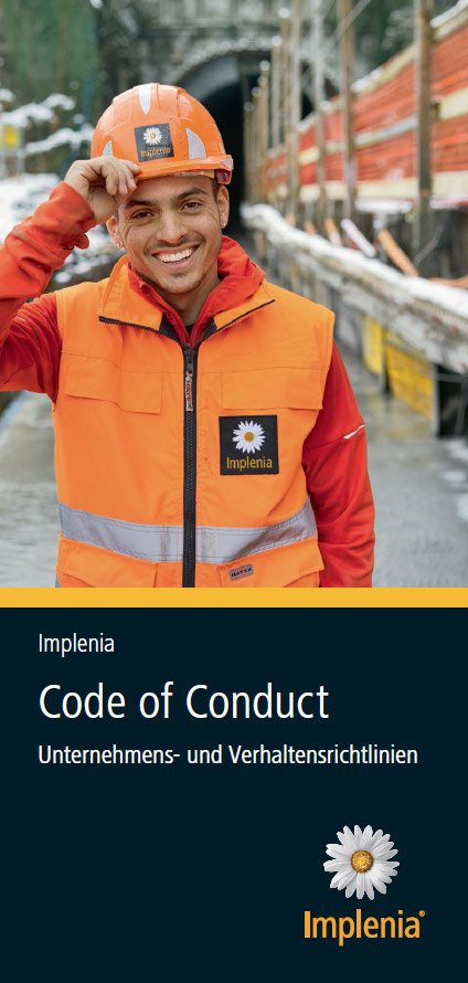 Im Code of Conduct «Wie wir arbeiten» hat Implenia seine Grundwerte als verantwortungsvoll handelndes Unternehmen definiert: Exzellenz, Kollaboration, Agilität, Integrität und Nachhaltigkeit. Der Kodex regelt sowohl das Verhältnis der Mitarbeitenden untereinander als auch die Haltung der Mitarbeitenden gegenüber Geschäftspartnern, Behörden und der Umwelt.