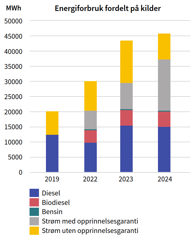 Energiforbruk innenfor scope 1 har økt i 2024 sammenlignet med 2019, noe som skyldes økt drivstoffbruk fra egne kjøretøy og maskiner, men prosjektene bruker nå en større andel driv- stoff fra fornybare kilder (biodiesel). Forbruket av biodiesel har økt betydelig på våre prosjekter siden 2019.