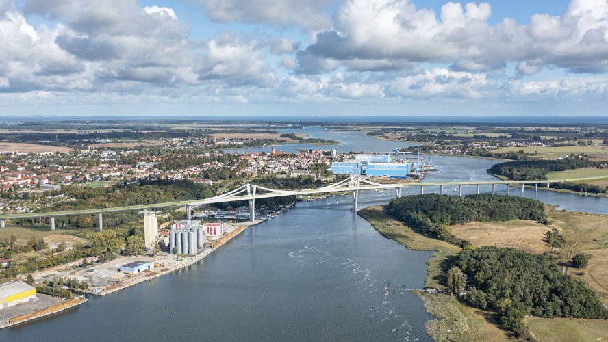 The new bridge over the Peenestrom strait will connect Usedom with the mainland and is being built as an extradosed bridge. Including the Wolgast foreland bridge and the bridge over Sauziner Bay, its total length will be around 1.4 km. Rising to a height of 42 m above the water and suspended from 70 m high pylons, it will be one of the largest bridges of its kind in Europe. As well as improving access to a region that was previously only accessible via bascule bridges, it will become a central traffic artery for business and tourism on the Baltic Sea. Construction work began in December 2025 and is scheduled for completion in February 2030.