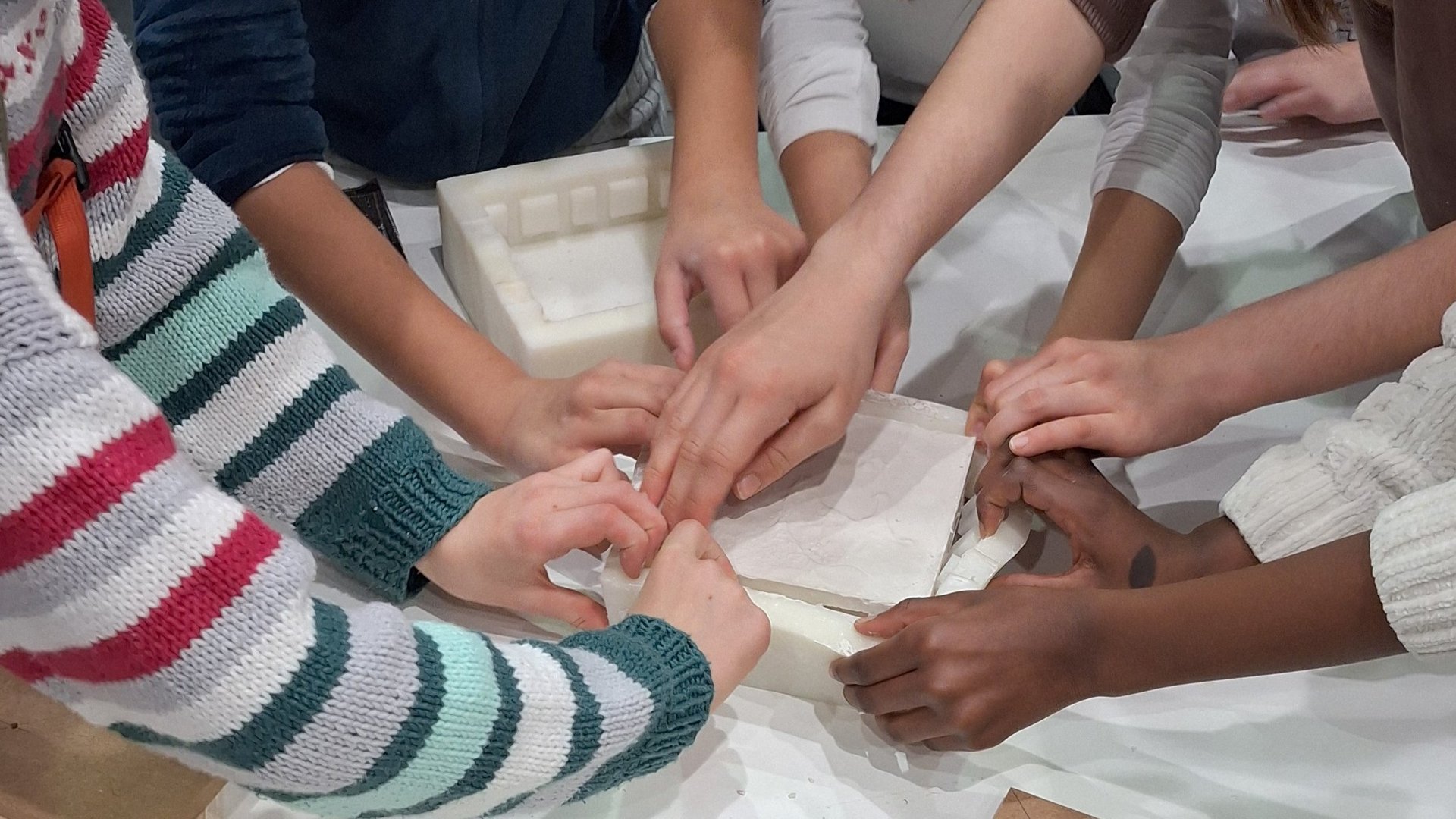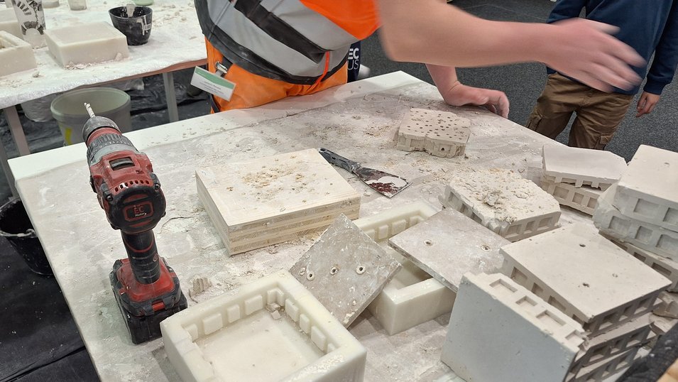 Fra mandag til fredag strømmet barna til standen i grupper på 20-25 stykker, og de brukte 45 minutter om gangen på å produsere komponenter av gips. "Vi produserte til sammen 89 komponenter, helt etter planen", understreker Frédéric Lablanquie. "Vi ville at barna skulle få se hvordan et ekte byggeprosjekt fungerer, sammen som et team og innenfor en stram tidsramme."