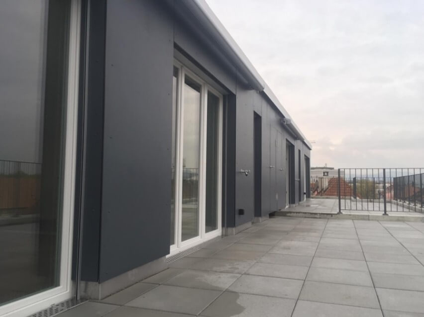 In einem ersten Schritt wurde die ganze Attikawohnung bis auf das Grundgerüst abgerissen. Bestehend neben der Holzrahmenkonstruktion, blieb die Abdichtung des Daches. Untergurten, Spurschwellen und vereinzelte Rahmenpfosten mussten aufgrund der Beschädigungen entfernt und durch neue ersetzt werden. Energietechnisch wurde die Konstruktion überarbeitet und auf den neuesten Stand gebracht. Als Fassade hat sich die Bauherrschaft für eine Beplankung aus grossformatigen Eternitplatten entschieden. Diese verleiht der frisch sanierten Attikawohnung ein dezent, aber elegantes Aussehen.