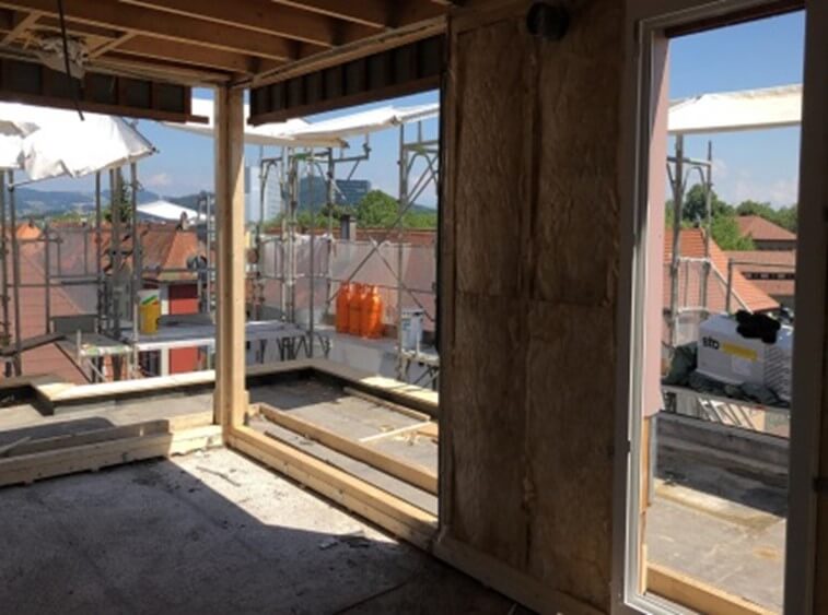 In der Attikawohnung, im Bereich Übergang Aussenwand zu Terrasse, konnte infolge einer defekten Bodenabdichtung, ungehindert Regenwasser unter die Holzrahmenkonstruktion gelangen. Diese wurde durch das eingedrungene und liegengebliebene Wasser derart beschädigt, dass die Attikawohnung einer Komplettsanierung unterzogen werden musste.