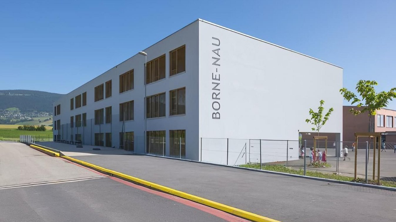 Die Schaffung von vierzehn Klassenzimmern, einem Raum für bildende Kunst, einem Musikraum und drei naturwissenschaftlichen Räumen mit Räumen für die Verwaltung und die Vorbereitung auf den naturwissenschaftlichen Unterricht. Die Architekten Guy Corbaz & Pascal Oulevay entschieden sich für ein Gebäude mit einem kompakten Volumen, das sich auf natürliche Weise in die bestehende bauliche Umgebung einfügt, und für eine Typologie mit modularen Räumen. Die Grundrisse wurden mit kleineren Klassen gearbeitet, entsprechend der neuen Gesetzgebung, die von 80 m2 Grundfläche und 3 m Höhe auf 64 m2 und eine Deckenhöhe von 2,7 m reduziert wurde. Diese Änderung ermöglicht dem Bauherrn eine durchschnittliche Kostenersparnis von 15%. Eine doppelläufige Treppe erinnert augenzwinkernd an die Einrichtungen des 19ᵉ Jahrhunderts und sorgt für eine fröhliche Note, während sie den Schülern den Verkehr erleichtert.