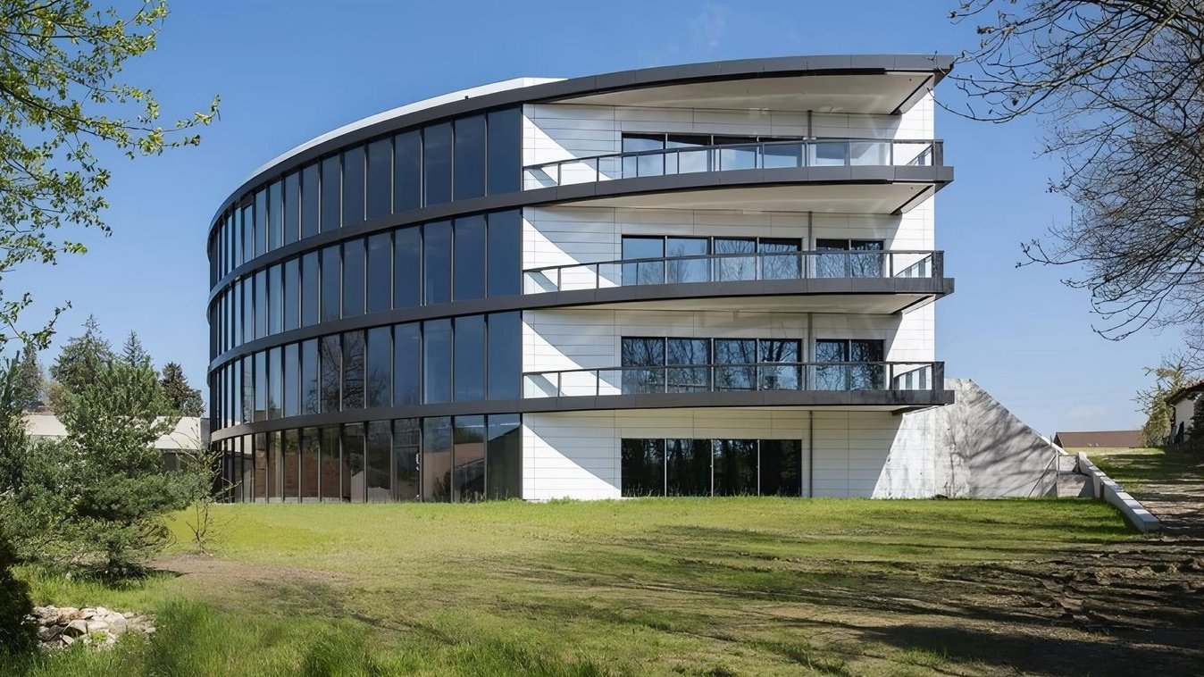 Das Gebäude zeichnet sich durch zwei visuell und schalltechnisch sehr unterschiedliche Fassaden aus. Im Norden zeigt die Fassade eine traditionelle langgestreckte Betonstruktur, die von durchgehenden Verglasungen über die gesamte Länge unterbrochen wird. Der Haupteingang des Gebäudes und die Zufahrt zum Parkplatz befinden sich auf der Nordseite. Da diese Fassade zur Kantonsstrasse hin liegt, war es das Ziel, sich vor Lärm zu schützen. Auf der Südseite hingegen öffnet sich die Fassade zum See und zu einer Grünfläche. Diese zweite Fassade ist vollständig verglast, um die Aussicht und die Sonneneinstrahlung optimal zu nutzen. Zunächst langgestreckt, endet sie in einer vollständig verglasten Rundung, die in eine Terrasse mündet. Um diesen natürlichen Lichteinfall in die Räume zu genießen, wurden verdunkelnde, nicht blickdichte Jalousien zum Schutz vor der Sonne bevorzugt. Eine vertikale Zirkulation in der Mitte des Gebäudes ermöglicht den Zugang zu den verschiedenen Räumen. Dieser Gemeinschaftsbereich ist mit Granit verkleidet.