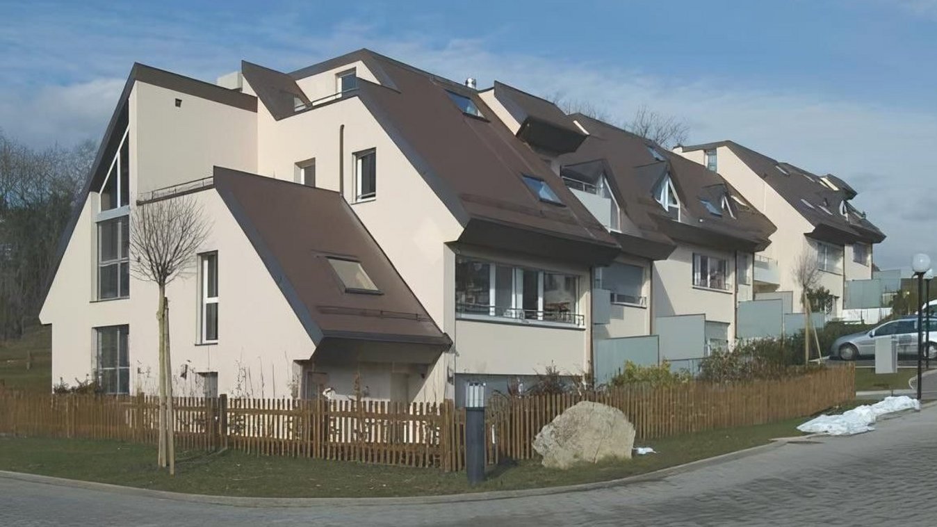 Das Gelände weist ein regelmäßiges, ziemlich ausgeprägtes Gefälle auf, und die ungünstige Beschaffenheit des Untergrunds ist der Grund für die gewählte Bauweise. Die gesamte Anlage wird mit einem SIA-Volumen von 12'350 m3 und einer Bruttogeschossfläche von 3'084 m2 entwickelt. Mit einer Grundfläche von 1'049 m2 sind die Gebäude auf einem Erdgeschoss und einem ersten Stockwerk sowie einem oberen Stockwerk mit einem Zwischengeschoss und angenehmen Dachterrassen errichtet. Das Untergeschoss ist teilweise ausgehoben und macht etwa die Hälfte der verfügbaren Tiefe aus.