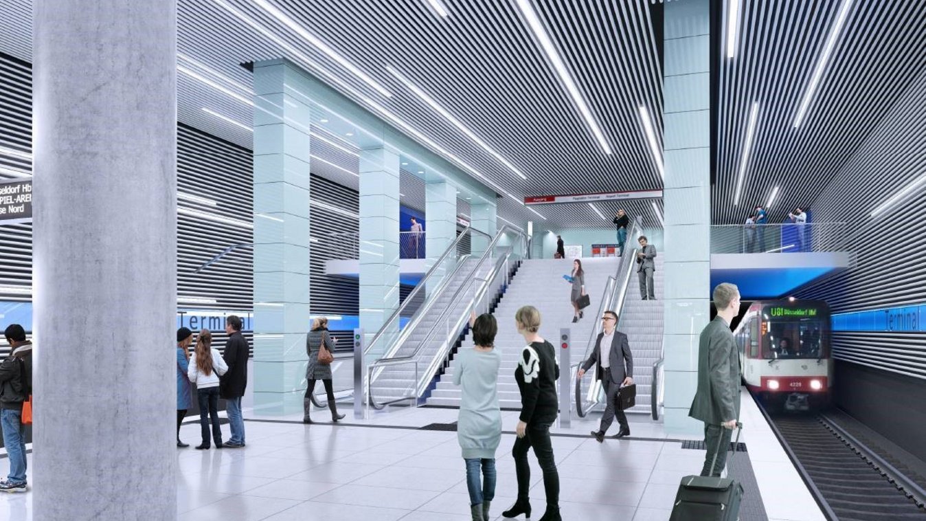 Bau einer neuen Stadtbahnlinie zur Anbindung des Flughafens in zwei Abschnitten/Losen. Neubau von Rampe, Trog, Tunnel und der Haltestelle (unterirdischer Bahnhof) Flughafen Düsseldorf in offener Bauweise.