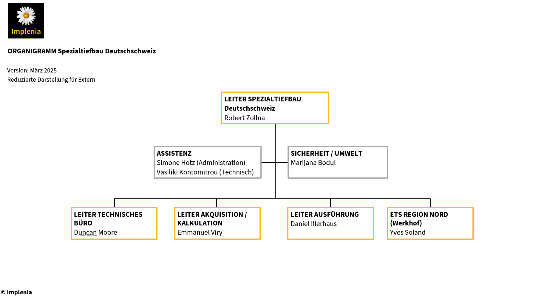 Der Implenia Spezialtiefbau hat seinen Sitz in Opfikon, Echandens und Onex und ist dem Gesamtbereich Implenia Tiefbau zugeordnet.