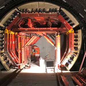 Bau von zwei parallelen Einspurröhren für die Bahn mit einer Gripper-TBM und einer Multifunktionsstelle im Sprengvortrieb.