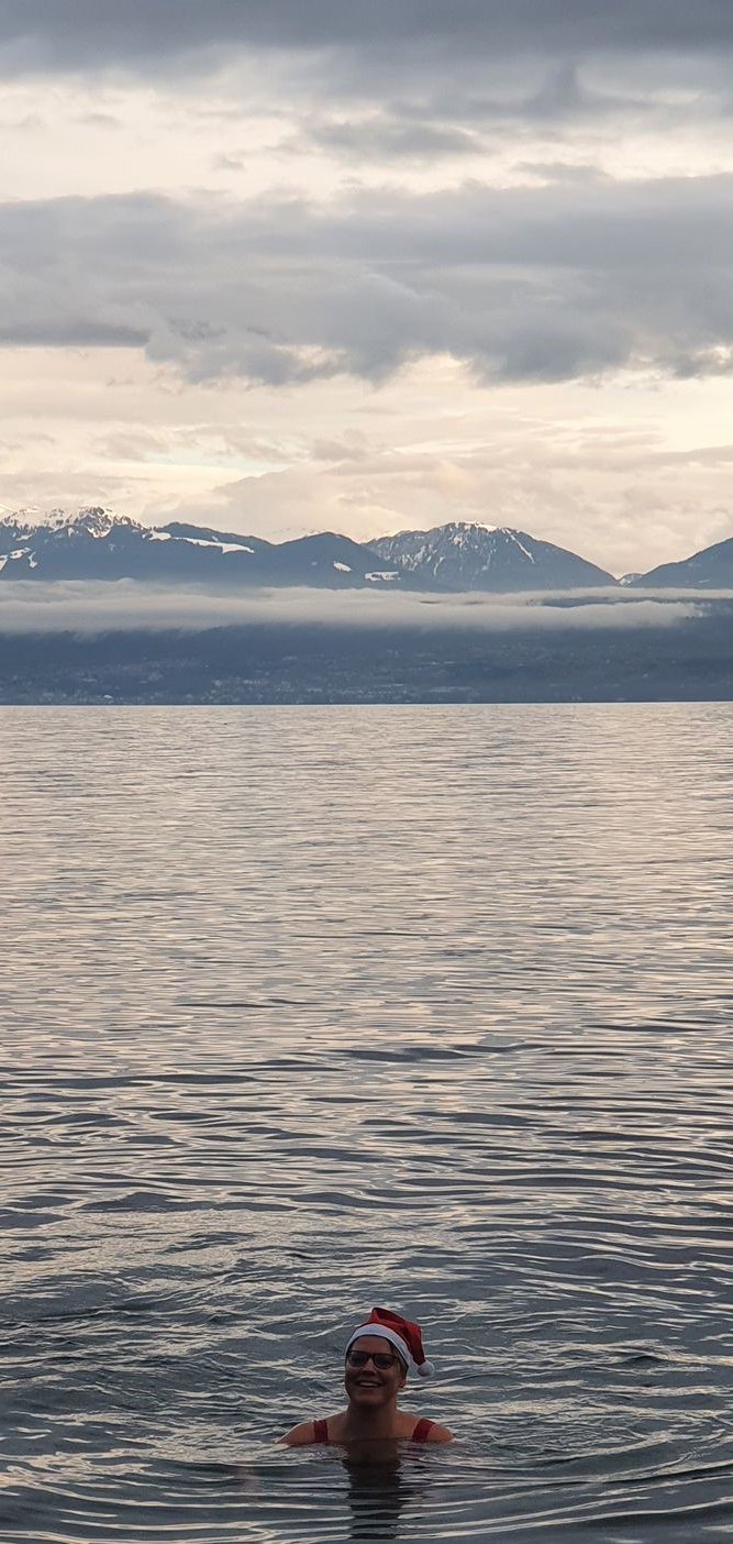 Det är en lite galen kollega som övertalade mig att delta i julbadet i Genève 2017: ungefär 100 meter i viken, mitt i december och i simdräkt! Först trodde jag att jag inte skulle klara det, men jag älskar utmaningar. Sedan dess simmar jag varje vinter med samma entusiasm.