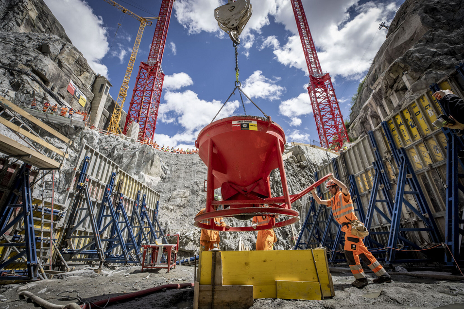 I början av juni började vi bygga muren på 2 000 meters höjd över havet: På Grimselpasset bygger vi en ny, cirka 113 meter hög, dubbelböjd bågdamm direkt framför den befintliga muren. Den gamla dammen kommer att vara kvar och kommer att dämmas på båda sidor. Den nya ersättningsstrukturen kommer att säkerställa att vattnet från Grimselsjön kan användas för att förse över en miljon människor med elektricitet.