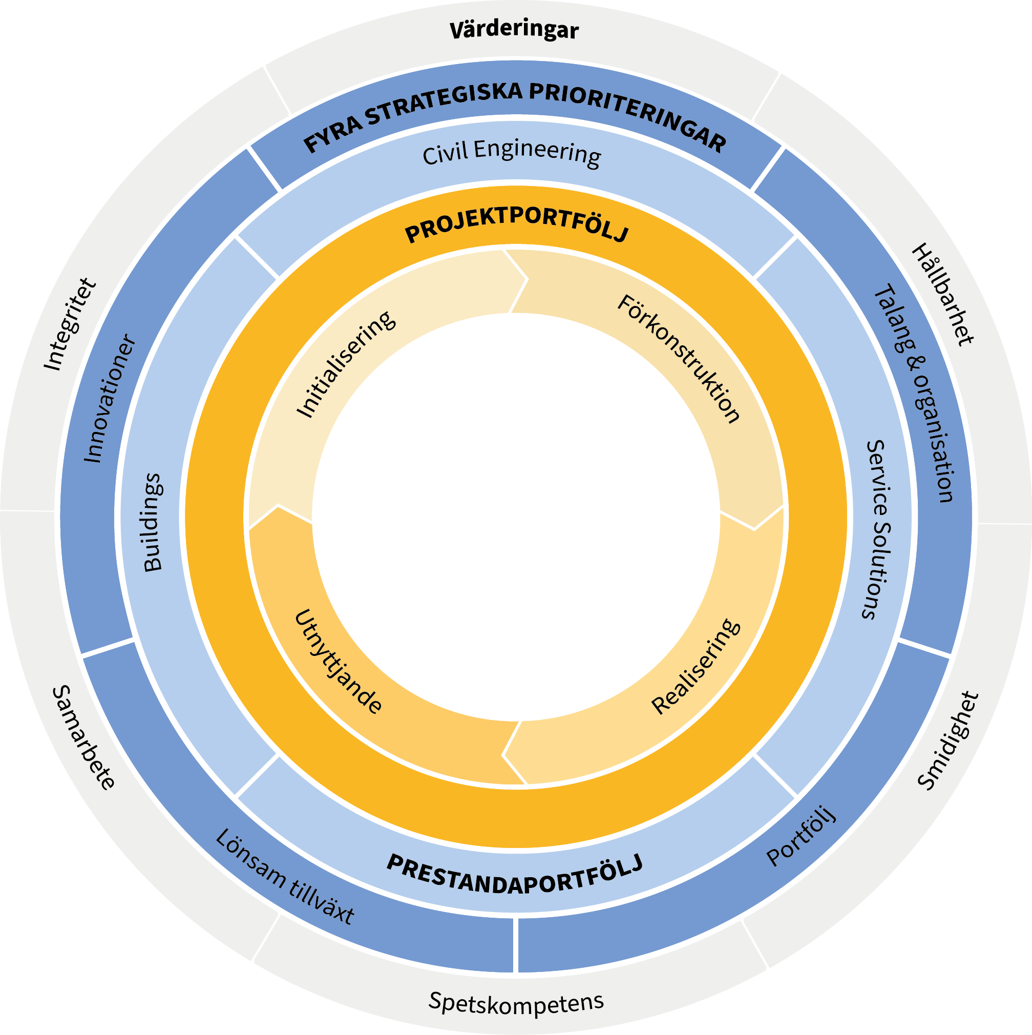 Som ledande multinationell leverantör av bygg- och fastighetstjänster har Implenia gett sig själv en tydlig inriktning och våra medarbetare sluter gemensamt upp bakom företagets värderingar. Implenia arbetar med fyra strategiska prioriteringar för att förverkliga sin vision och genomföra sitt uppdrag.