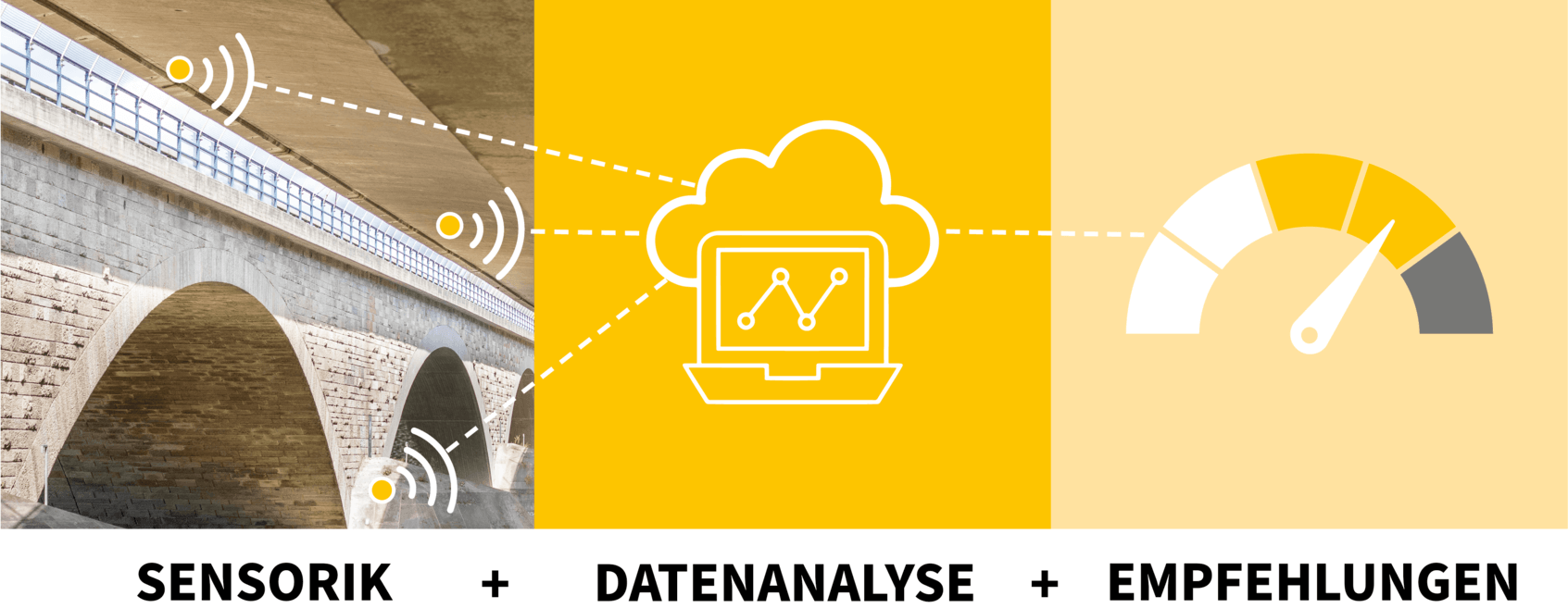Sensors enable continuous measurement and evaluation of external influencing factors such as settlement, temperature and traffic load. This enables our experts to better assess the risks to the traffic and structural safety of the structure. The real-time use of sensors enables rapid action to be taken if limit values are exceeded. Safety risks are detected at an early stage and can be eliminated by replacing critical components.