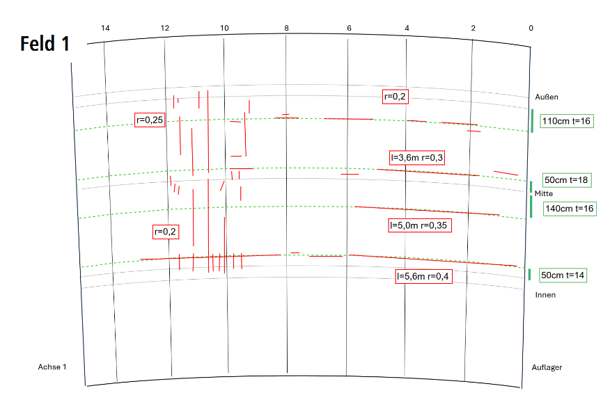 The cracks are drawn in approximately according to their position and noted with length and crack width. Individual photos are added to the documentation, which are used as a reference for changes in condition during the next inspections.