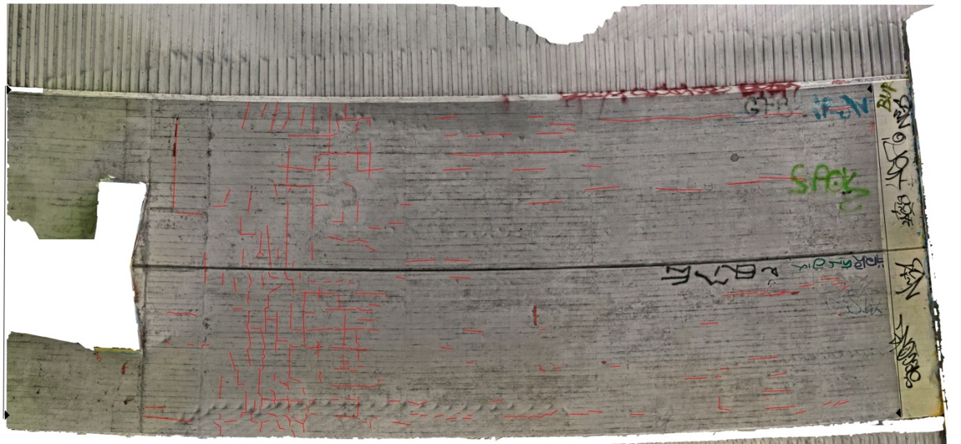 The evaluation of these images is still the responsibility of the building inspector. They can use the orthophotos as a basis for their assessment. The scaled representation means that the largest cracks no longer need to be explicitly described, as the length of each crack can be taken from the image.
