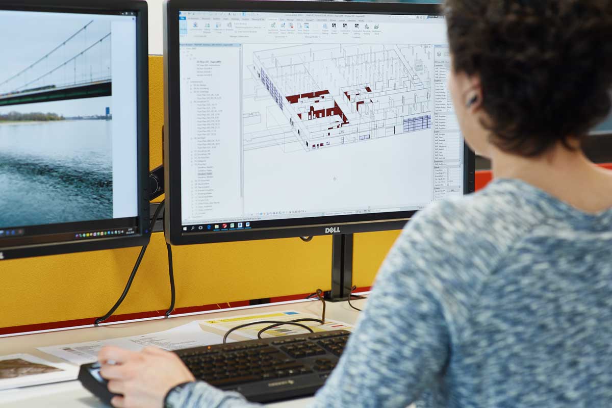 Building Information Modelling (BIM) is a central part of the digitalisation of the construction industry. We use BIM to improve our internal processes such as design, execution and operation of buildings to make them more effective. In engineering and infrastructure construction this is a particular challenge: the complex building structures, the inclusion of the surrounding terrain and different manufacturing processes make standardisation difficult. We create model-based designs for both the building geometry (formwork) and the reinforcement. The BIM models are also used for coordination with other internal units and external project participants.