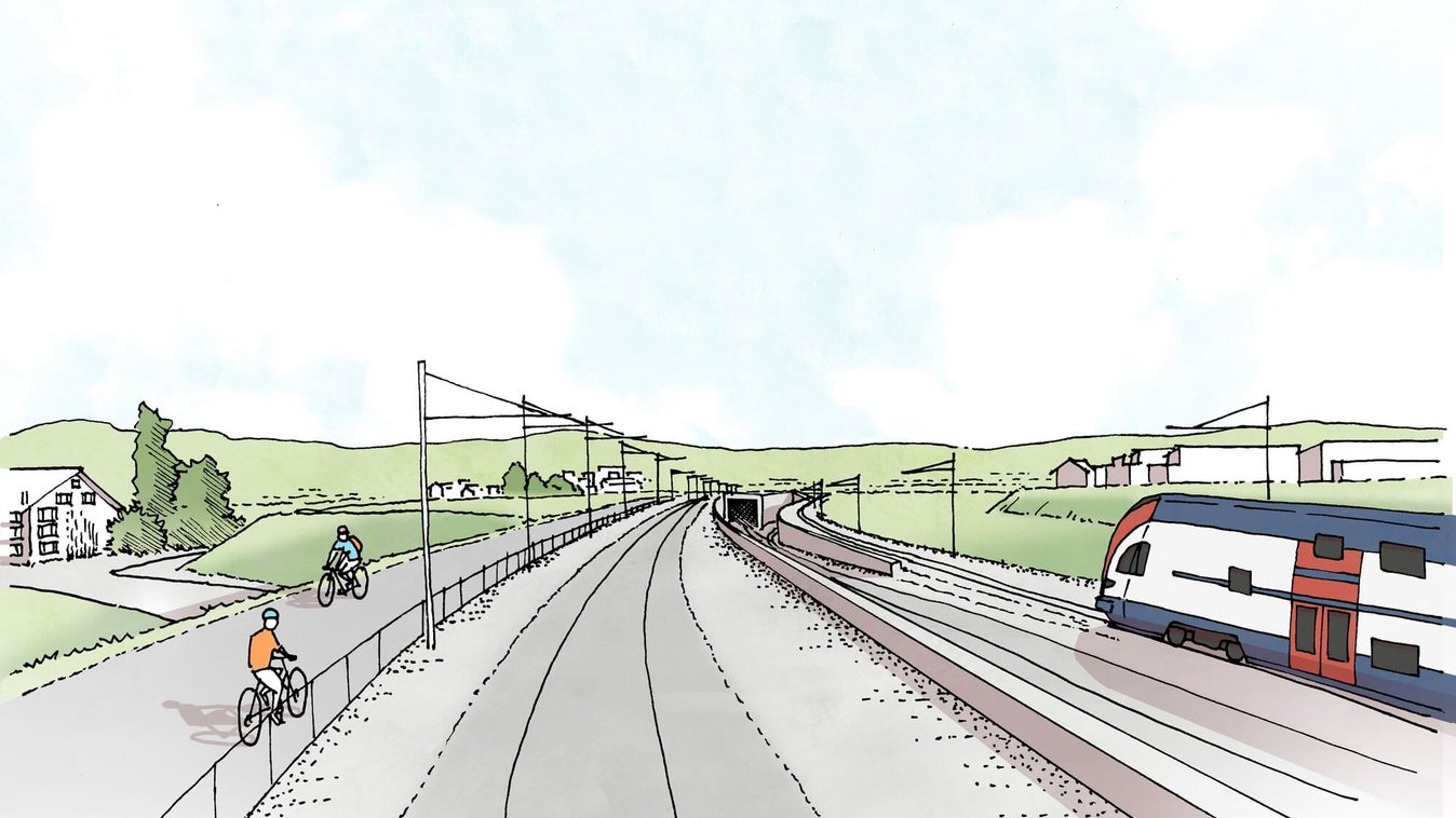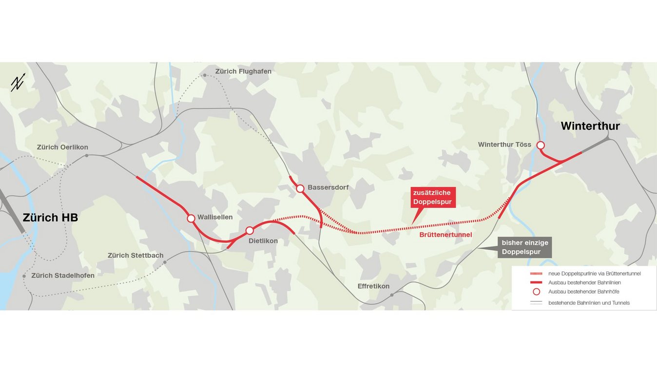 Das Kernstück zur Behebung des Kapazitätsengpasses zwischen Zürich und Winterthur ist der rund 8.3 km lange Brüttenertunnel, der einen ca. 1 km langen Abzweig in Richtung Flughafen aufweist.