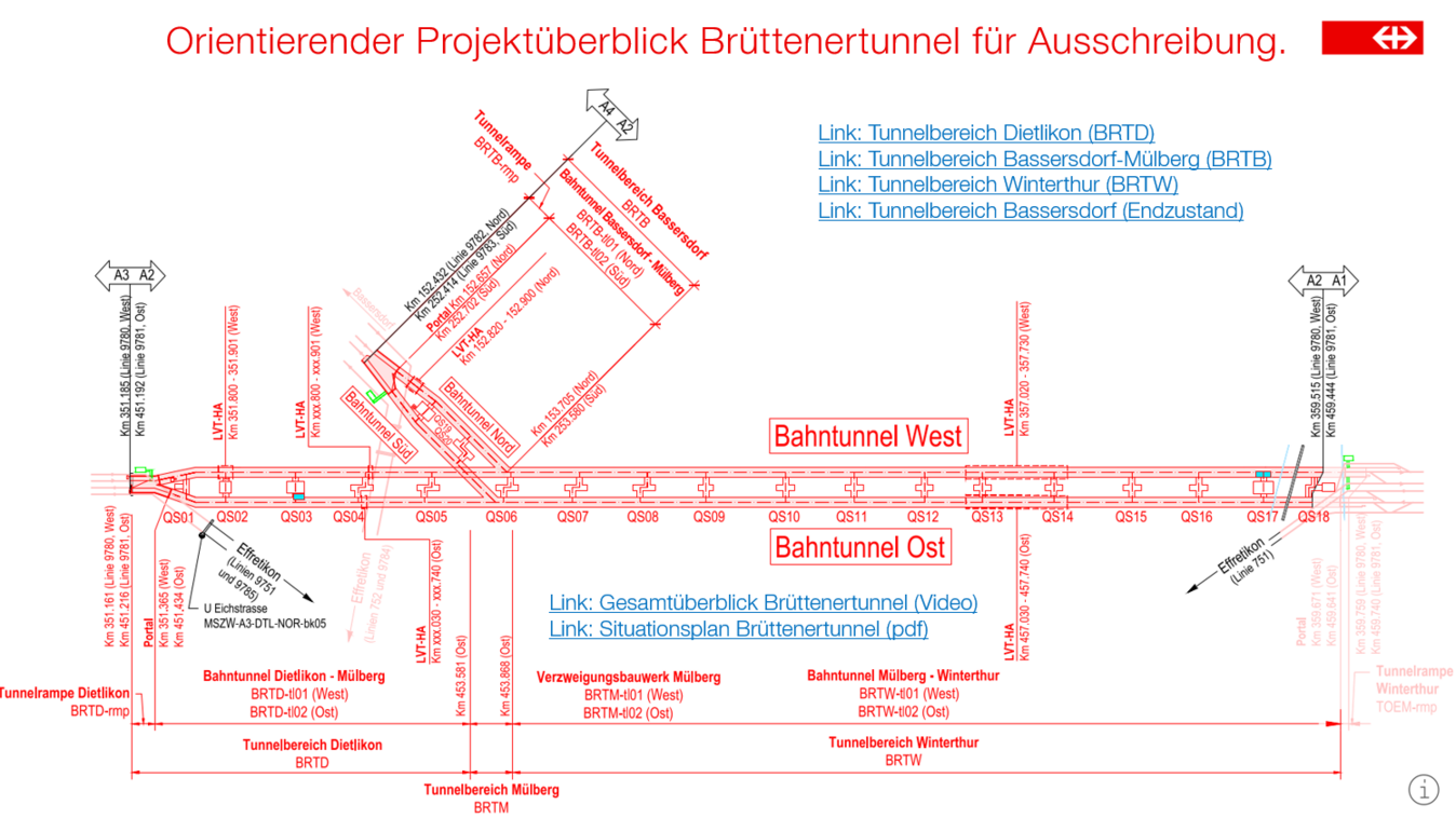 - Der Ausschreibung liegt ein digitales 3D-Rohbaumodell zugrunde. Das 3D-Rohbaumodell des Brüttenertunnels stellt die Grundlage für die Realisierung des Brüttenertunnels durch den Unternehmer in der Form der Methodik BIM-to-field dar.